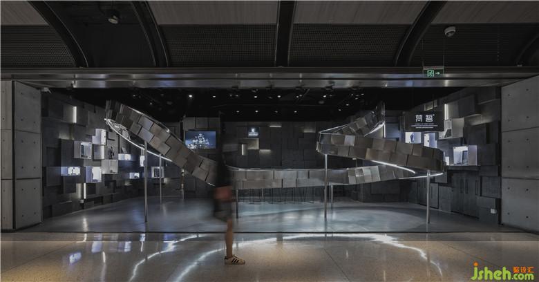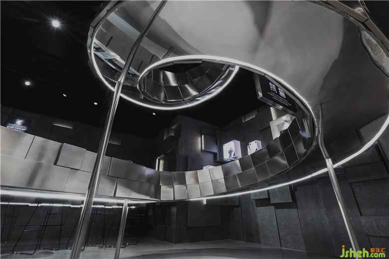深灰色的幽暗背景,銀色的鉆石紐帶在空間中飛舞旋轉(zhuǎn),顧客自然的被紐帶所吸引著,進(jìn)入展陳空間,欣賞美好的珠寶設(shè)計(jì)作品。紐帶在不同高度自然的形成引入的拱門,平滑的展柜,舒適的顧客服務(wù)區(qū),以及最耀眼的螺旋塔冠。