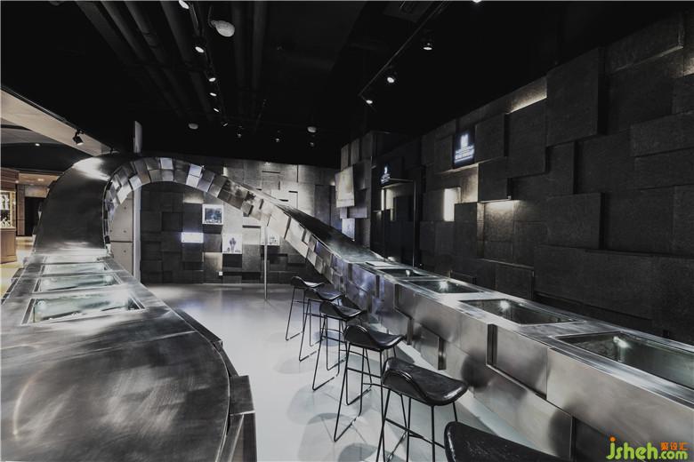 誠(chéng)品中大多店面以白色為主,木色搭配,相對(duì)空間比較均質(zhì),缺乏關(guān)注點(diǎn)。本案的顏色、造型都大大區(qū)別于別的店面,并結(jié)合業(yè)態(tài)之后重新闡述新的空間效果。整個(gè)空間被深灰色石材包裹著,一條銀色紐帶在空中飛舞,如同一個(gè)深黑色珠寶盒中散發(fā)異彩的鉆戒,從形式上隱喻項(xiàng)目主題。
