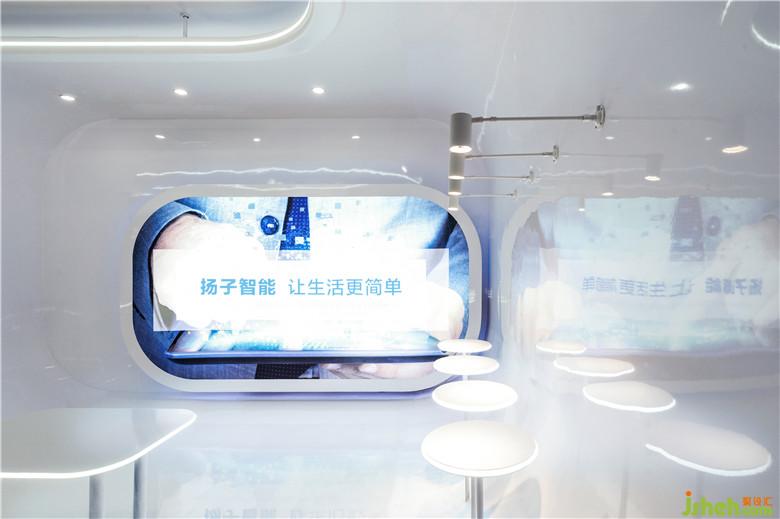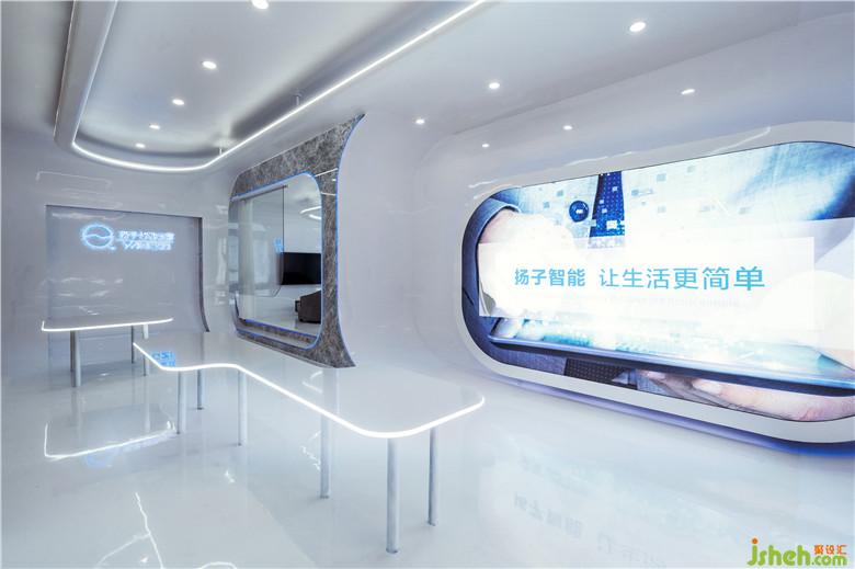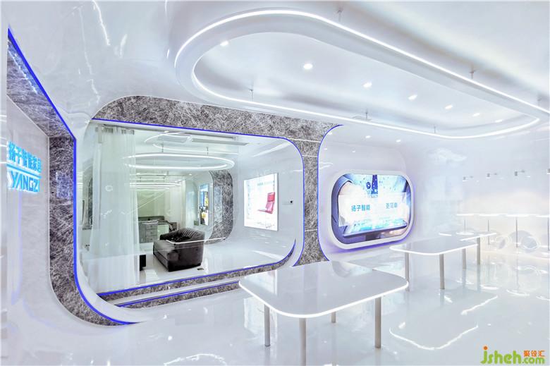 從模塊空間的界面形狀到展臺(tái)的邊緣、信息墻的形狀、燈具的造型,整體均貫徹處理成為弧線,柔化科技的距離感和冰冷感,裝修公司使智能家居的呈現(xiàn)更加親切自然。為強(qiáng)調(diào)曲線造型,在邊緣交界處的墻面使用大理石貼面,石紋質(zhì)感強(qiáng)調(diào)家居屬性,為空間添加了重色,豐富了層次感,也使純白色的空間環(huán)境不至于過(guò)度冷漠。
