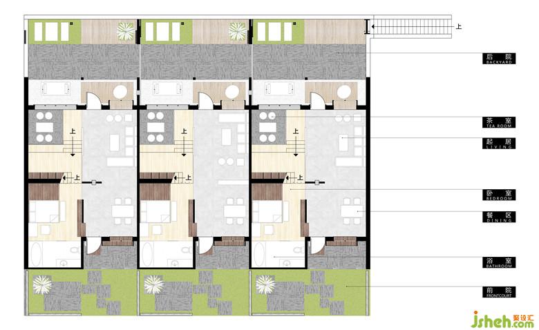 原場地由一個開間21.6m,進深8.2m的房舍和前后兩個院落構成,設計將原始建筑平面于東西向等分,保留原有門窗、結構梁,形成三個相對獨立的居住單元,保證了各自的獨立私密性,運營方面也可作分開出租。