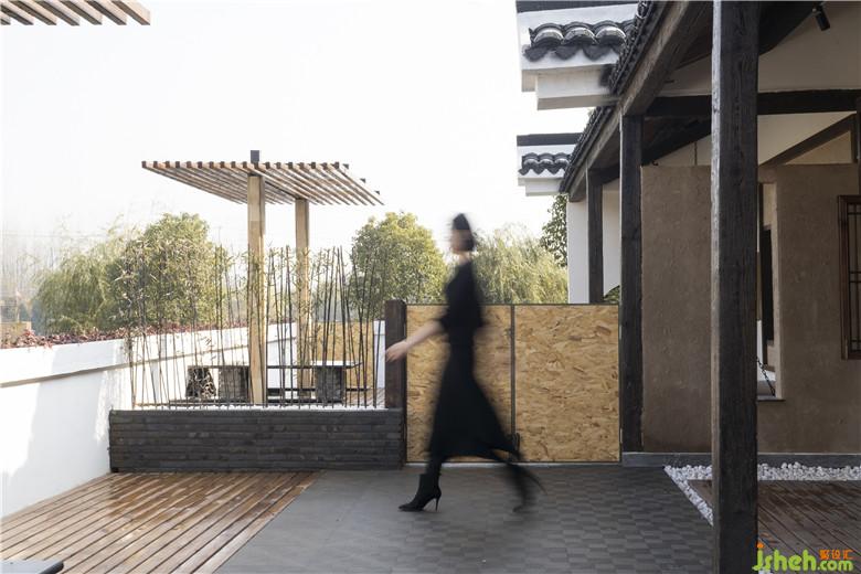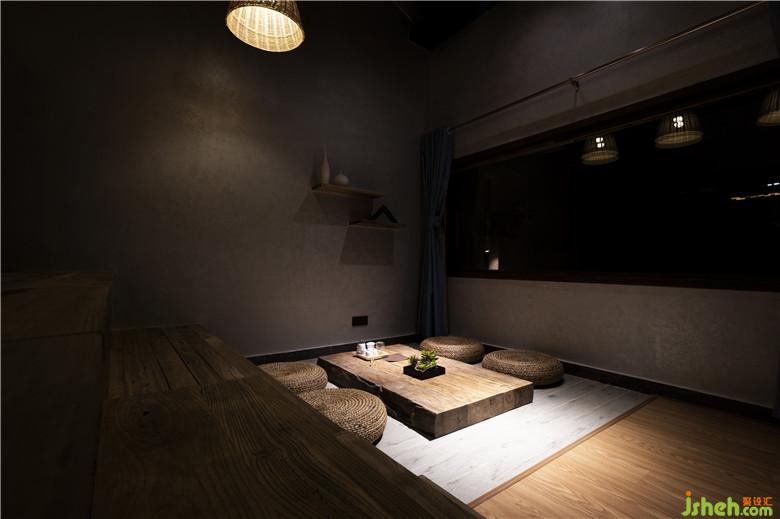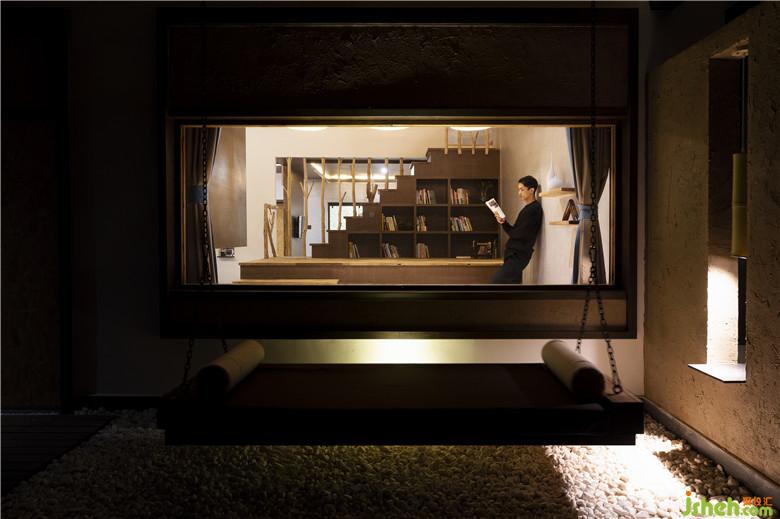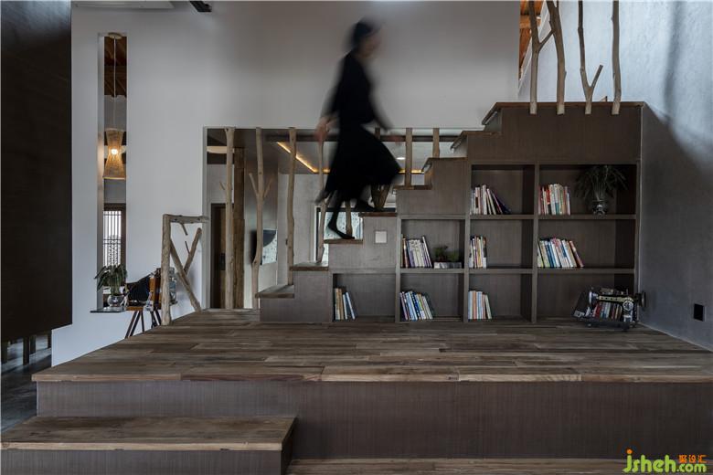 我們試圖構(gòu)建空間的延續(xù)性和整體性,以打破傳統(tǒng)室內(nèi)“房間”限制的壁壘。建筑內(nèi)部沒有一處完全封閉的功能性空間,“似斷非斷”格擋設(shè)計(jì)代替了“門”:從一層就餐區(qū)透過衣架可若隱若現(xiàn)地窺探到臥室;臥室與閱讀區(qū)通過的原始的樹干木欄間隔限定空間的同時(shí)又保持了視線一定程度上的通透性;榻榻米式的茶藝區(qū)與客廳空間得以相互借景。