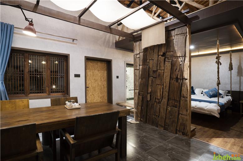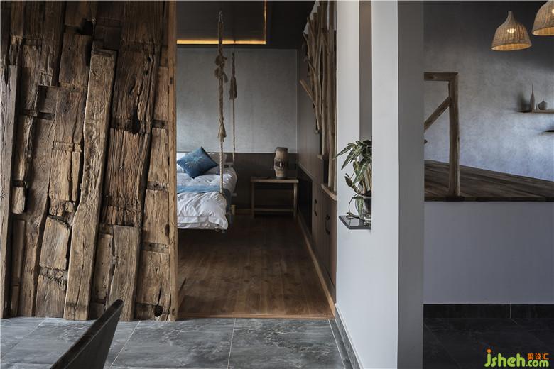 材料與鄉(xiāng)野元素運(yùn)用:入戶秋千、繩垂掛下的沙發(fā)吊床是心歸田園的悸動(dòng);質(zhì)感斑駁的淺灰色藝術(shù)墻漆結(jié)合古樸的老榆木裝飾,餐桌區(qū)頂部紗幔自木架懸掛來,整體透出如置身鄉(xiāng)間的野趣,飄渺悠閑,古樸靜謐。用樸素的材料組合打造出了素雅且極具辨識(shí)度空間。酒店設(shè)計(jì)