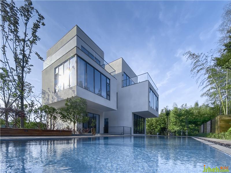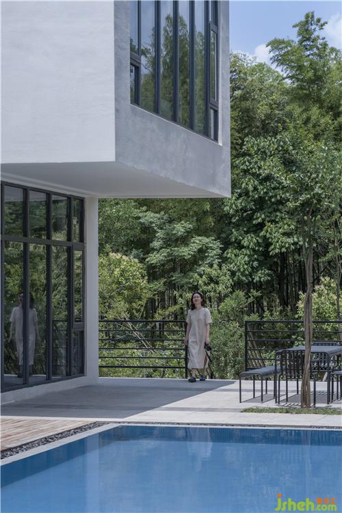 建筑通體呈現(xiàn)簡約的白色,通過方盒子的穿插組合、形體上的退讓或出挑,不僅豐富空間類型,獲得更多能夠親近自然的灰空間,又能保持整體純粹的建筑形式。最終讓建筑既融入在這片綠意盎然,又引人注目:建筑、遠(yuǎn)山、竹林、流水共同構(gòu)建出了現(xiàn)代人所向往的詩意棲居生活,樸素、自然、閑適。民宿設(shè)計(jì)
