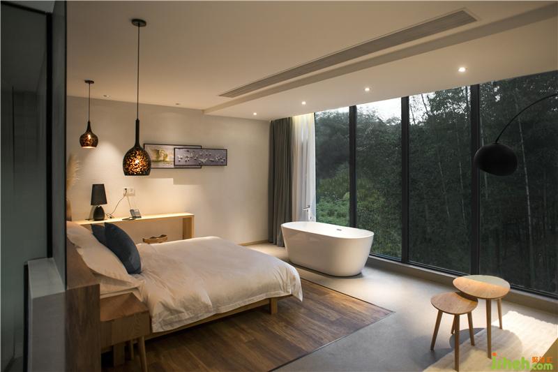 在二、三層的客房,設(shè)計(jì)師根據(jù)每間客房所處方位與周邊自然條件,采用了朝向不同景觀的大面積轉(zhuǎn)角落地窗。民宿設(shè)計(jì)