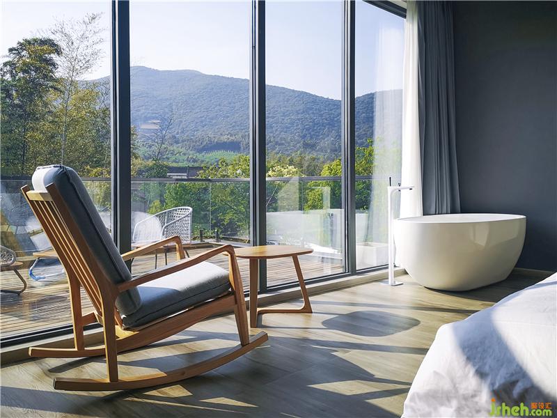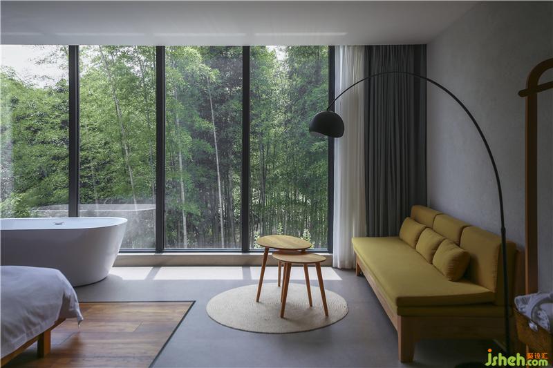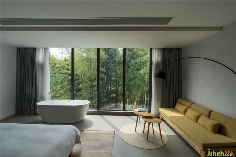 同時(shí),每間客房的主題與其觀賞到的不同景觀(溪澗、遠(yuǎn)山、茂密的竹林等)呼應(yīng),這將不同的自然景觀如同畫卷一般完整地在住客眼前展開,建筑內(nèi)部實(shí)現(xiàn)了對自然景色最大化的吸納,“探溪”“沐陽”“搖竹”等別致的房間名也由此得來。