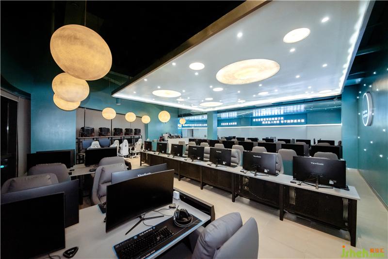 為了更好地突出網(wǎng)咖的主題概念,將吊頂作為設(shè)計(jì)的重點(diǎn)部分。吊頂采用石膏板,并結(jié)合燈珠和LED燈帶等不同燈具點(diǎn)晴視覺效果,成功統(tǒng)一了空間內(nèi)元素,奠定了室內(nèi)的整體基調(diào)。墻板藍(lán)色的底色,結(jié)合彎曲延伸的燈帶和星羅棋布的燈珠營(yíng)造出銀河太空般夢(mèng)幻的氛圍。光成為一種全新的設(shè)計(jì)語言,大大小小的圓形光源宛若小小星辰,不僅在功能上聚焦人們的視線,也體現(xiàn)出空間的明暗層次,更好的豐富了玩家的休閑娛樂體驗(yàn)。燈光在材質(zhì)表面暈展,材質(zhì)對(duì)光也有良好的映射效果,在這里,燈光似乎改變了空間,游戲玩家在虛擬世界中探索遨游,釋放自己,追逐著內(nèi)心的星辰。會(huì)所設(shè)計(jì)
