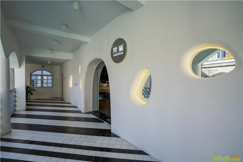 外墻面用真石漆刷成素白色,門的造型呼應(yīng)洞穴概念。幾個形態(tài)不一的流線型曲面造型的窗戶在周圍線性燈帶的均勻的照射下泛著溫暖的色彩,使空間視覺更具穿透性與連貫性,同時這些洞穴造型為新加厚突出裝飾層打洞做出的效果,對原有墻面不會產(chǎn)生破壞。