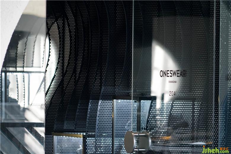 整個空間設(shè)計(jì)從展品的布置開始,因?yàn)榭紤]到業(yè)主提出要將原來店鋪的珠寶盒重新利用放置在新店中,設(shè)計(jì)師將舊珠寶盒隱匿于墻面的穿孔板中,弱化了珠寶盒龐大的體量和方正的造型。同時,將珠寶盒嵌制于墻上也為中心流線型網(wǎng)紅打卡裝置節(jié)省出較大空間。墻面采用穿孔板切割成片狀曲面,并滿足一定防火等級要求。