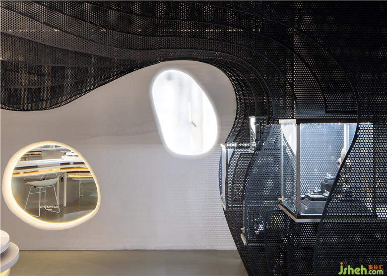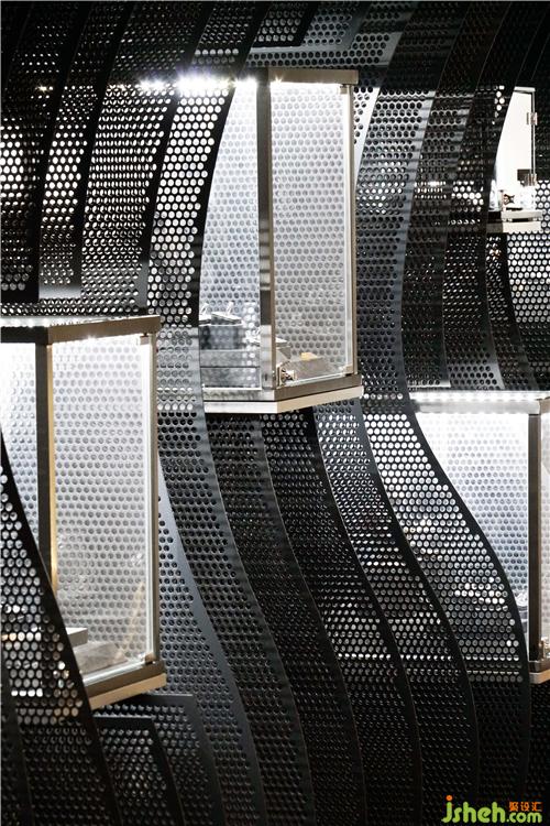 展柜創(chuàng)新地將藝術展示和零售兩種功能融合在一起,珠寶店鋪設計展現(xiàn)了品牌特色并具有藝術性。飾品在深灰色盒子的映襯下如同寶石般發(fā)出耀眼奪目的光。