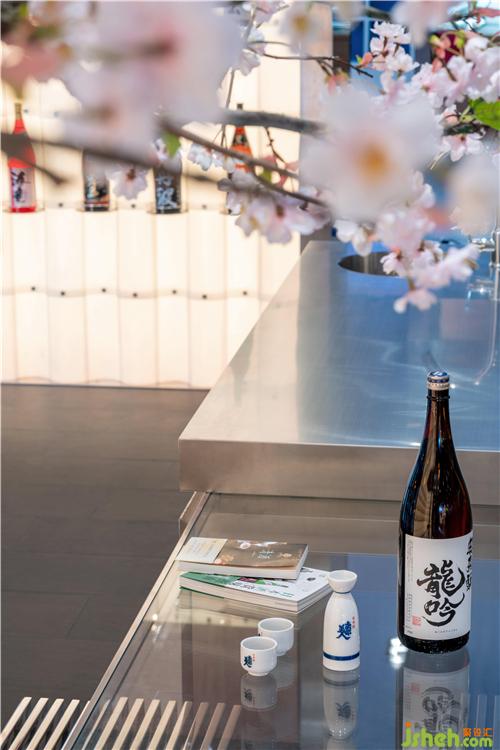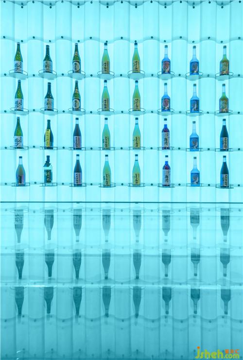 清酒瓶主要為玻璃和磨砂玻璃兩種材料、顏色多樣,取包容性最強(qiáng)的超白玻璃和磨砂透光玻璃為空間主要材料來呼應(yīng)清酒的質(zhì)感,但出于安全性考慮將展示墻瓦片用磨砂亞克力材質(zhì)置換磨砂玻璃材質(zhì),二者的質(zhì)感是極其相似的。
