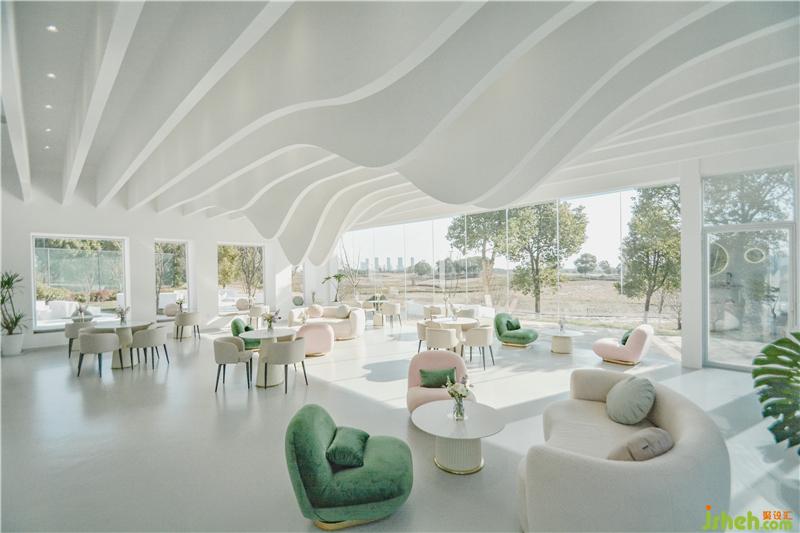建筑一層包含了靈活有趣的開放空間,規(guī)模不同的包間,以及配套的廚衛(wèi)后勤空間, 二層作為靈活布局,可舉辦不同的包場聚會活動。大廳內(nèi),蘇州咖啡廳設(shè)計結(jié)合原有木梁設(shè)計的白色波浪形狀的吊頂,俏皮地倒掛在天花板上,映襯著窗外的天空和云朵,儼然生成了一幅畫中畫。燈光從掛片中打下,簡潔高雅,營造出藝術(shù)的氛圍。舒適的家具和地毯,提升了空間的品質(zhì),隨意又不失精致感。自然擺放的二三盆綠植,有趣地點(diǎn)綴了這片純白的空間。