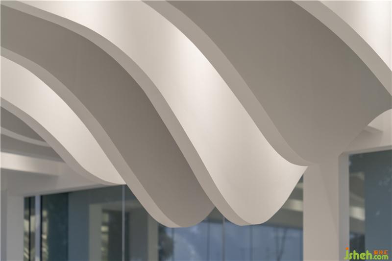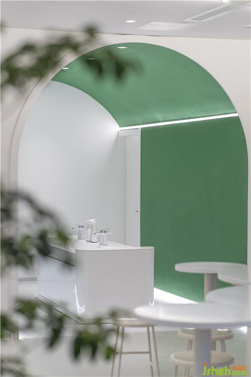 圓形地面的院子步道與金屬球形雕塑作為最簡單的主入口,簡潔大方,符合LIM咖啡的品牌的主旨,在品賞美味之余,供訪客合影留念。大面積的白色穿孔鋁板,給人明亮輕松之感,引領(lǐng)來者進(jìn)入館中。