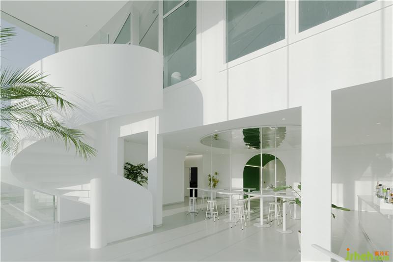 The ground floor contains flexible and exciting open space, private rooms of different scales, and supporting kitchen and logistics space. The second floor is used as a flexible space for various activities. In the lobby, the white wavy ceilings designed with original wooden beams are playfully hung upside down from the ceiling, reflecting the sky and clouds outside the window, creating a picture-in-picture. The light is laid out from the hanging film, concisely and elegantly, creating an artistic atmosphere. Comfortable furniture and carpets enhance the quality of the space without losing a sense of elegance. Green plants are placed naturally and interestingly, decorating the pure white space.