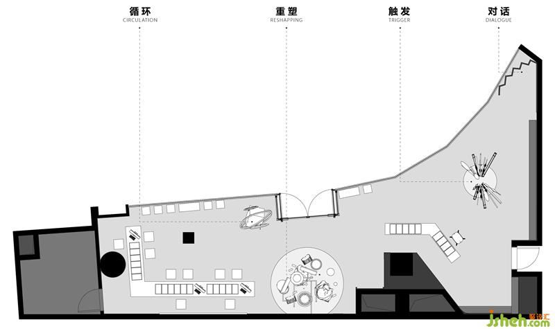 對于人類而言, 遺忘一直是常態(tài), 而記憶是例外。在這個不斷發(fā)展日益更新的數(shù)字時代下,設(shè)計師通過對話、觸發(fā)、重塑、循環(huán)這四個階段進(jìn)行故事的敘述和延展,將空間作為容器,承載并引導(dǎo)著故事的發(fā)生,并激發(fā)出消費(fèi)者與空間的相互關(guān)系。在這里,獨(dú)具匠心的打卡裝置、深灰色的墻面、閃耀奪目的珠寶乃至消費(fèi)者們,都找到了最適合自己的位置。記憶重塑,故事開啟,一眼瞬間,一念永恒。