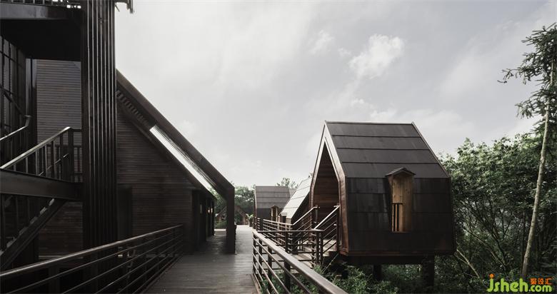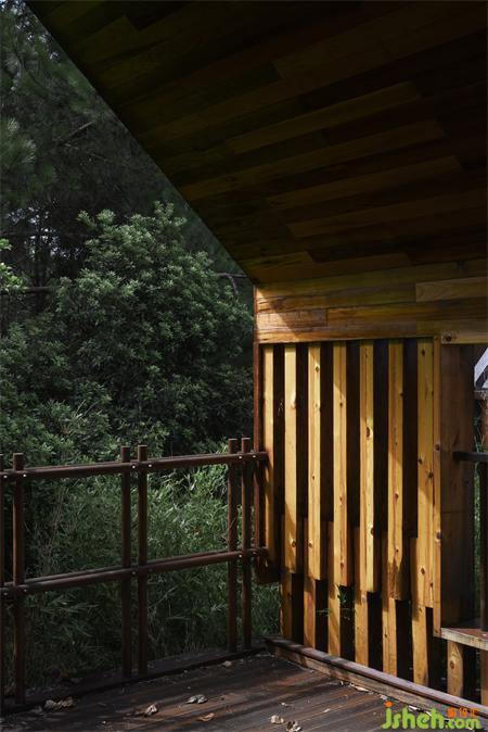九江民宿設(shè)計(jì)也得益于這樣的天然稟賦和設(shè)計(jì)方法,最終呈現(xiàn)的建筑反而充滿呼吸感:3種類型的小木屋模塊嵌入到場地中,平臺(tái)為適應(yīng)地形而呈現(xiàn)出高低錯(cuò)落的節(jié)奏。我們決定了木屋的朝向與開口方式,使他們成為互相之間的取景框。小木屋主材采用防蟲防腐處理后的洪雪松木,還暴露著原始的木制紋理。我們甚至不希望這里看起來像一座干凈整潔的新建筑,而應(yīng)該是材料與環(huán)境間已經(jīng)持續(xù)數(shù)載的一場親密對(duì)話。