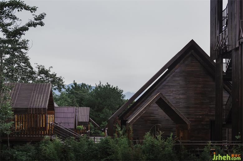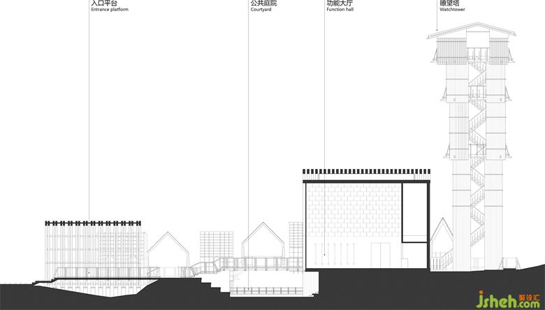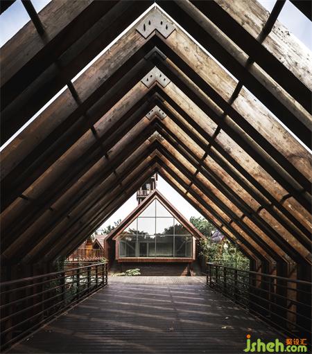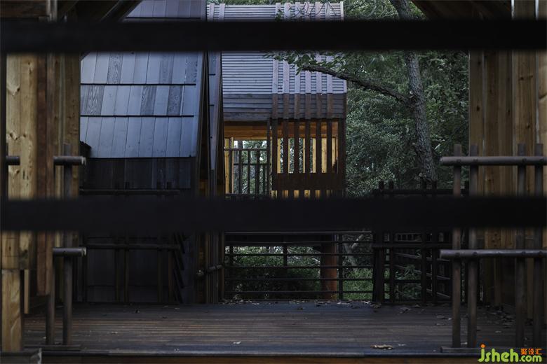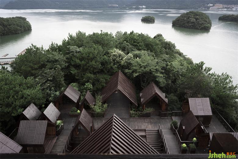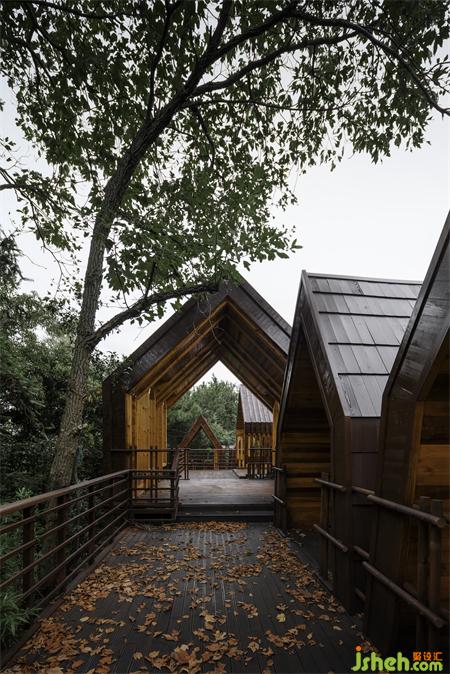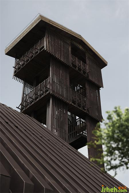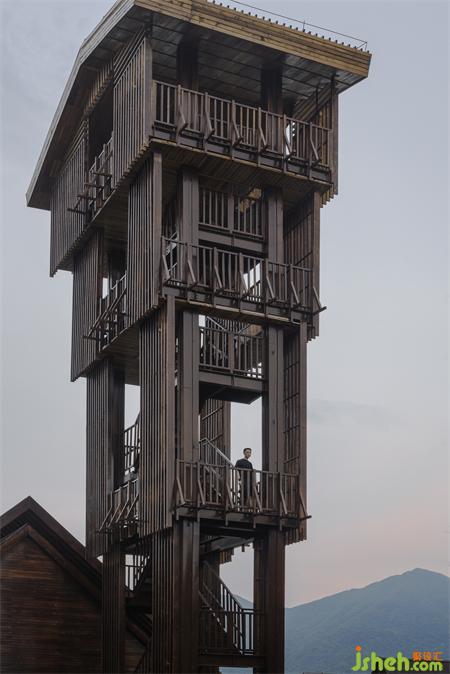 The steel structure observation tower is the highest point of the entire island, visitors can have a good view for the whole lake area when standing on the top. The fa?ade of anticorrosive wood grille designed to reduce wind resistance presents various permeability from different viewing angles: when people looking from the boats on the lake, the towers erected in the jungleis looming. At sunrise and sunset, sunlight seeps from the gaps in the grille.