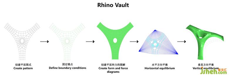 展廳設計造型本身是基于推力線網絡分析方法生成的:首先通過圖形解和力圖解的對應關系,獲得薄殼結構在二維空間的合理形態(tài),然后利用線性優(yōu)化算法結合外荷載數值對可行解優(yōu)化,最終求得結構三維空間結構。相當于計算機輔助設計:在確定方案時,不僅能夠最大程度的發(fā)揮材料的效率,降低造價,也會使得建筑更加輕盈、合理。