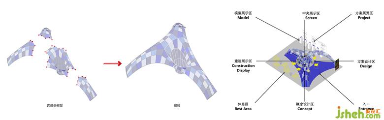 展廳設計從形態(tài)生成到建模與結構體系優(yōu)化,再到后期建造施工,計算機全方面地介入每一個設計階段,使得原本復雜的曲面拱形結構體系在配合模塊化施工技術的支持下有足夠的可行性。在計算機輔助設計的支持下,“超級”展亭展現了非線性結構分析技術與建筑形式美學的完美融合。