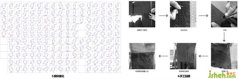由于廣州設計周現場布展只有短暫的三天時間,我們選擇了輕便可人工操作的藍色透明膜材料作為表皮,圓鋼管作為框架,先在工廠預制框架,然后運輸至現場搭建膜表皮。在這個過程中,我們將設計過程整合到計算機軟件工作流中處理,全面改進了從設計到建造的流程,快速、有效率地完成了拱形曲面結構的建造施工。巧妙的定制化構筑物不僅體現了戴爾計算機高效的設計輔助性能,而且完美地呈現了未來設計師的創(chuàng)作場景。