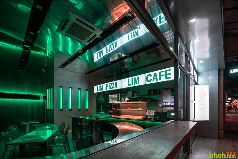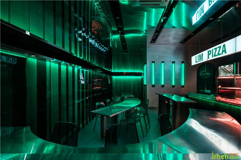 Green can often bring people a series of positive emotions such as freshness, nature, tranquility, youth and relaxation, which is in line with the design theme of Lim's brand color and space. The feeling of collision between green space and pizza also represents delicacy and nature. Additionally, light with green makes the space full of strong expressiveness and tension.