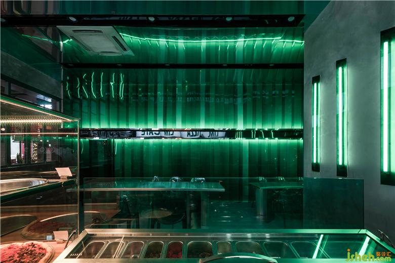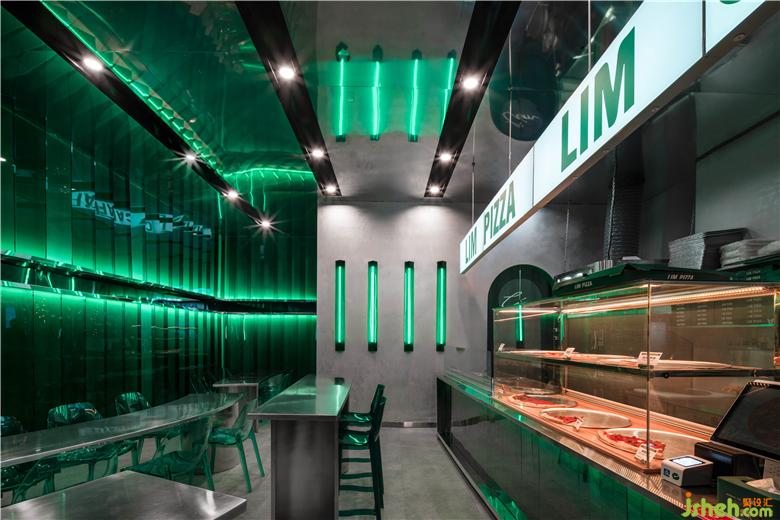 綠色往往能給人以清新、自然、寧?kù)o、青春、放松等一系列的正面情緒,符合LIM的品牌顏色和空間的設(shè)計(jì)主題,通過(guò)綠色的空間與披薩給人的感覺(jué)發(fā)生碰撞感,意味著美味與自然的碰撞,以綠色為主配合燈光使空間具有較強(qiáng)的表現(xiàn)力及張力。