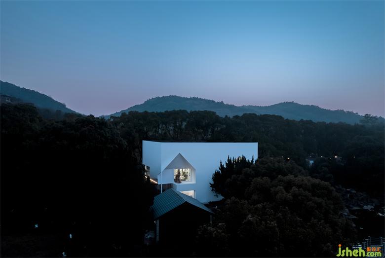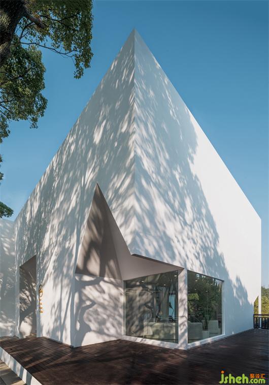 白色、純凈的立面投射出棧道兩側斑駁婆娑的樹影,整棟建筑與自然融為一體。