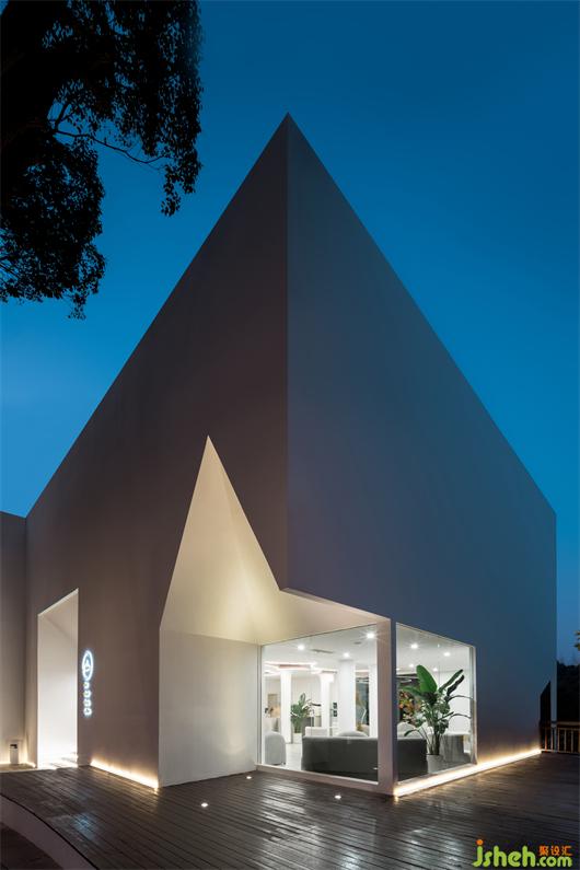 為了與原有建筑的坡屋頂形式有所呼應,并延續(xù)品牌一貫的坡頂白墻的設計元素。設計師用純凈的白色方盒子外殼將原有的建筑包裹在內部,立面以坡屋頂形式的窗洞向內延伸,將原有建筑與外部方盒子相連接。