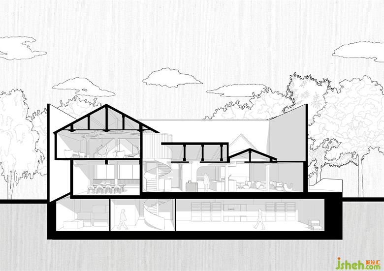 采用這樣的手法,一方面,使外部新建的立面表皮與原始結構脫開不影響原有結構,創(chuàng)造出表皮與原建筑之間的半私密天井;另一方面則以建筑體量削減法的方式,運用屋型開窗形式延續(xù)坡頂元素,增添建筑的趣味性。