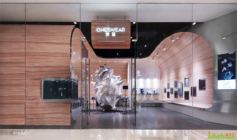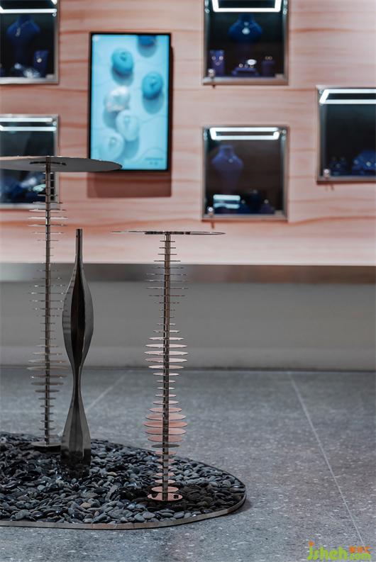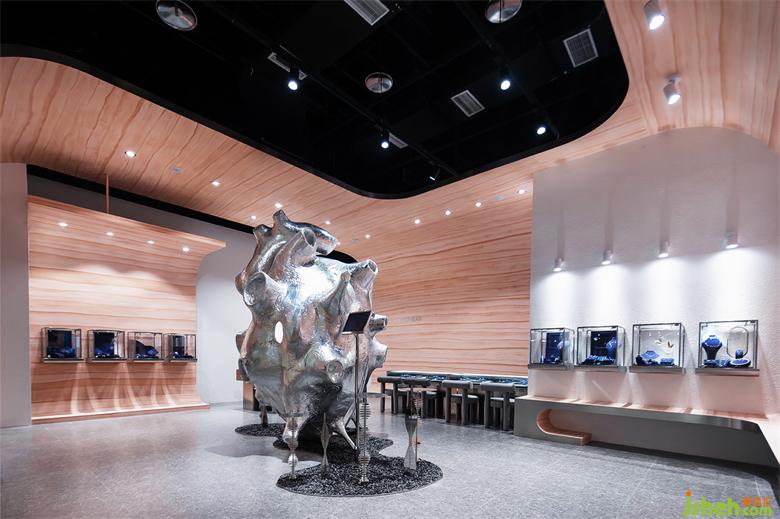In the design, the advantages of the original regular site are used to create a complete and unified free experience space. The wallwith rammed earth paint is like a flowing ribbon surrounding the whole space. The wall that should be vertically intersected is chamfered. The soft and flowingshape of the curve itself gives people a soft and dynamic feeling. The stainless steel side of the wall reflects the exquisite sense of the jewelry shop and the pursuit of detail quality.