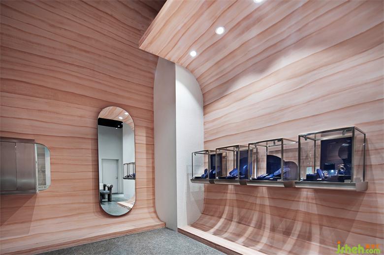 珠寶店設(shè)計(jì)中利用原本的規(guī)則場(chǎng)地優(yōu)勢(shì)去打造一個(gè)完整統(tǒng)一的自由體驗(yàn)空間。夯土漆的墻面造型宛如一根流動(dòng)的飄帶包圍著整個(gè)空間,本該垂直交接的墻面進(jìn)行倒角處理,利用曲線本身柔軟流動(dòng)的效果,給人以柔和又富有動(dòng)感的感覺,配合夯土漆的粗糙肌理,讓人在粗狂與柔美、克制與自然中尋求統(tǒng)一。墻體側(cè)面不銹鋼包邊體現(xiàn)了珠寶店的精致感和對(duì)細(xì)節(jié)品質(zhì)的追求。