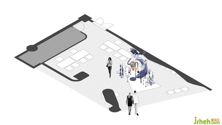 ▼雙入口視線集中于空間中心的藝術(shù)裝置,Thesight of two entrances focus on the art installation in the center of the space