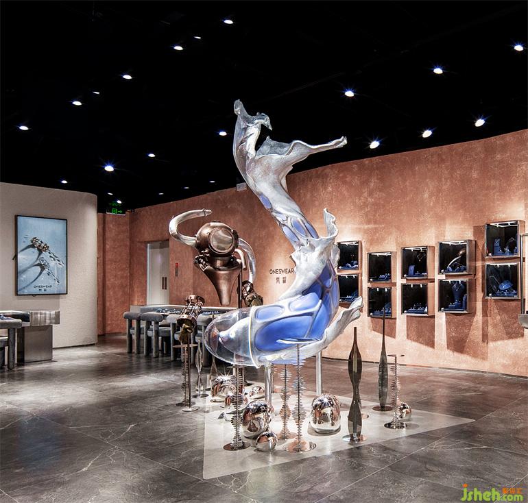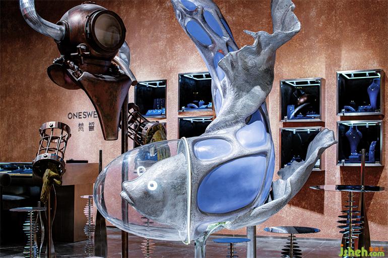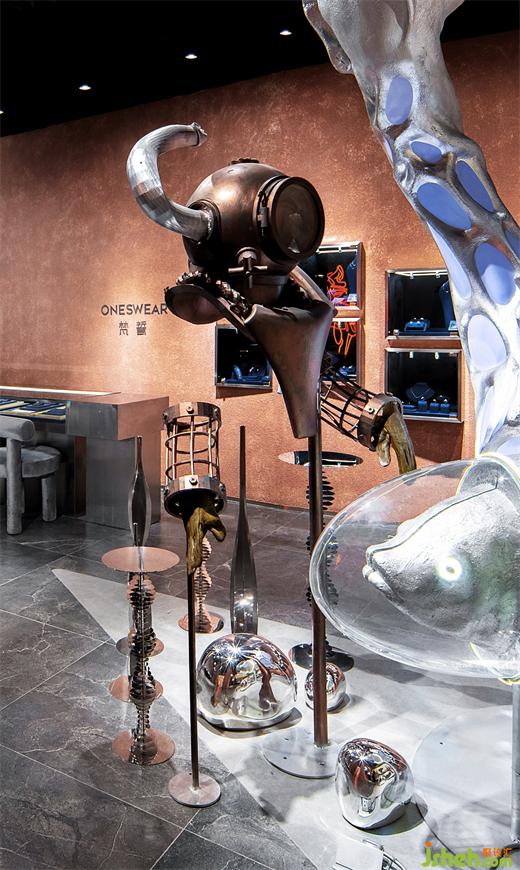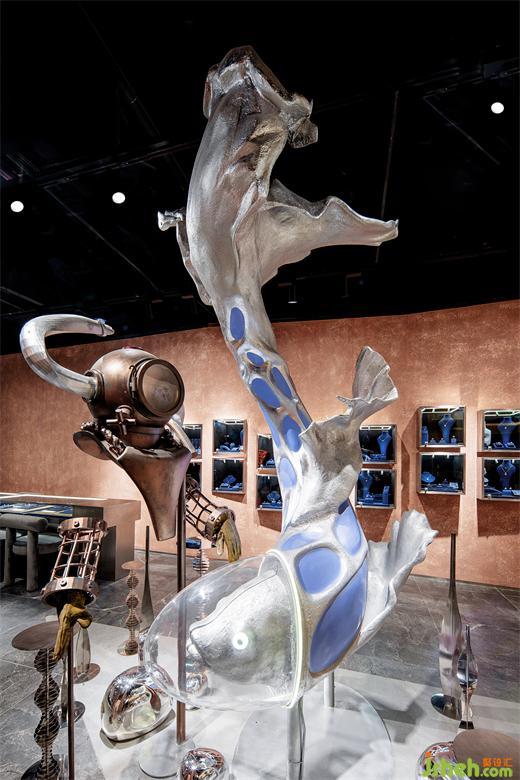 長(zhǎng)沙珠寶店設(shè)計(jì)位于門店主入口中央最顯眼處的藝術(shù)裝置以組合的形式呈現(xiàn),兩個(gè)主體作為邂逅的主角各自呈現(xiàn)特質(zhì)又和諧共存于深海世界。