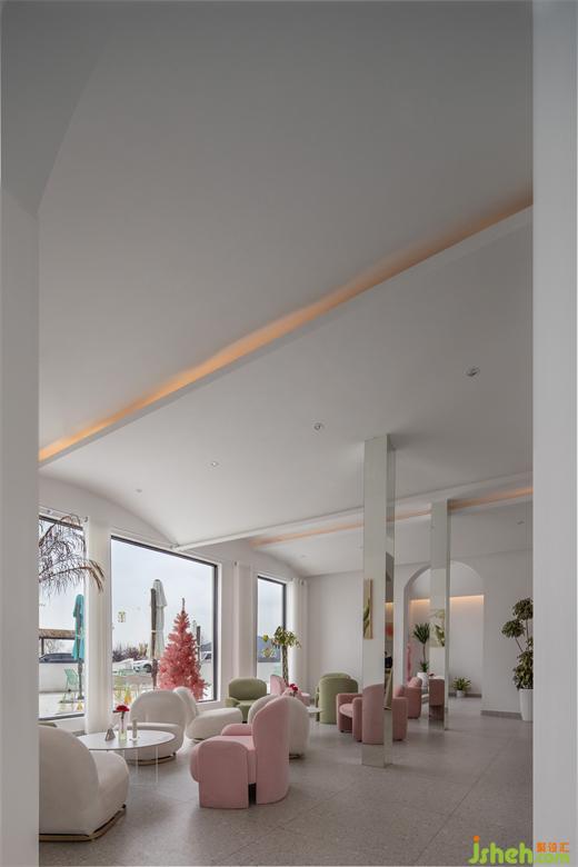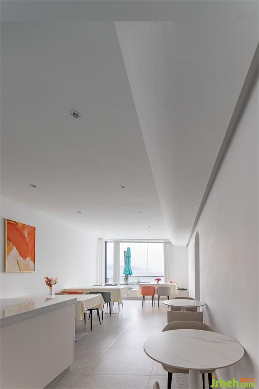 Thanks to the demolition of the original windows and doors, the old building and the new added part are more coherent and the usable area has been expanded a lot. We put the bar counter into the space by attaching the old and new walls, so that the whole hall can connect and radiate the whole space with the coffee bar as the core. The longer bar uses a circular arc at the junction of spaces to guide people to the other end of the space. The new built auxiliary building on the right is used as an area where the owner usually receives some personal friends. The space as a whole is dominated by clean and tidy white tones, and some colors are dotted on the furniture. The indoor ceiling and stairs use stacked arcs as the basic language components to wrap the space, just like the backflow collision when the lake water is pushed to the shore and splashes.