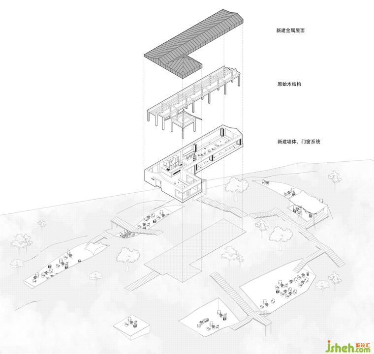 茶室設(shè)計(jì)既有建筑是由一個(gè)木構(gòu)架的廊道和亭子組成的休憩配套建筑,且兩個(gè)構(gòu)筑不是同一時(shí)間建造的。場地面朝四明湖,背靠環(huán)山竹林,東側(cè)和北側(cè)的竹林給人很強(qiáng)的包裹感。在這樣自然資源極為豐富的空間,我們和業(yè)主都認(rèn)為該項(xiàng)目應(yīng)建立與自然長期的鏈接,重新喚醒使用者對于自然的感知。基于對現(xiàn)場的空間感知,我們提出了兩個(gè)重要的設(shè)計(jì)要點(diǎn)作為設(shè)計(jì)的切入點(diǎn):微介入和觀景。