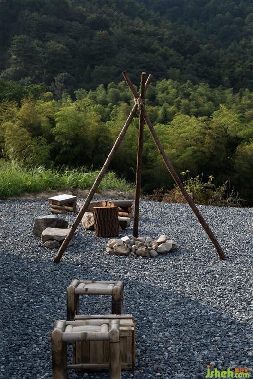 順應(yīng)楊梅園的自然地理形態(tài),采用嵌入的方法在室外塑造出幾塊露天營(yíng)業(yè)區(qū),通過砌筑擋土墻、鋪灰色砂礫石、使用原木加工的桌椅等方法來弱化這一片區(qū)對(duì)自然的入侵感,與周遭環(huán)境融為一體。