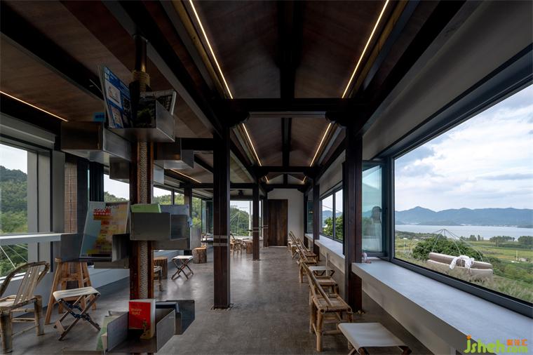 與周圍環(huán)境的互動(dòng)在任何建筑中都具有極其重要的意義。茶室設(shè)計(jì)環(huán)境本身有其獨(dú)特的氛圍,不同的周邊環(huán)境會(huì)賦予建筑以不同的特質(zhì)。忽視周邊環(huán)境而建造的建筑只能算作滿足使用需求的產(chǎn)品,而無法展現(xiàn)出多樣性和生動(dòng)性。在豐富多彩的環(huán)境中從事建筑設(shè)計(jì)令人欣喜,周邊的街道、樹木、村落、竹林、山脈等等,都應(yīng)該被納入建筑設(shè)計(jì)的考慮之中,以創(chuàng)造出充滿生氣和多樣表情的建筑。正如有句話說:“橋上的人在看風(fēng)景,看風(fēng)景的人在樓上看你”,事物之間相互依存、相互關(guān)聯(lián),這才使生活充滿了詩意。站在山下遠(yuǎn)眺茶室,茶室本身成為了一道風(fēng)景,同時(shí)在茶室內(nèi),人們可以盡情欣賞四明山和四明湖的美景。人與人之間保持著一定的距離,但通過觀察與被觀察,空間的表達(dá)中融入了這種微妙的聯(lián)系,這也增添了趣味和情感層次。