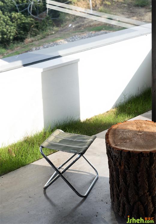 茶室設(shè)計(jì)保留了原場(chǎng)地不規(guī)則矩形的地基,將部分室外草坪置于室內(nèi)。