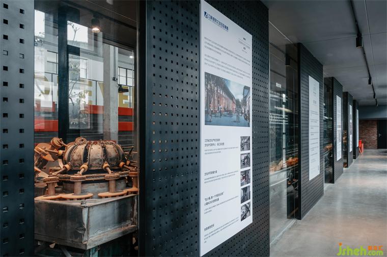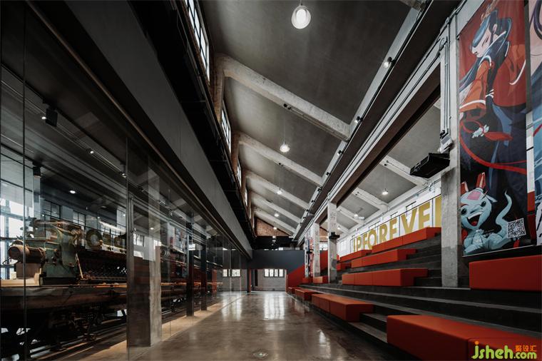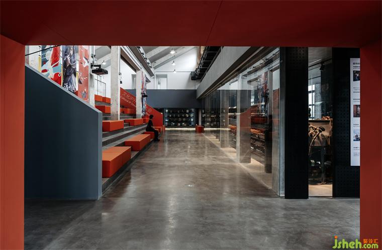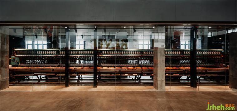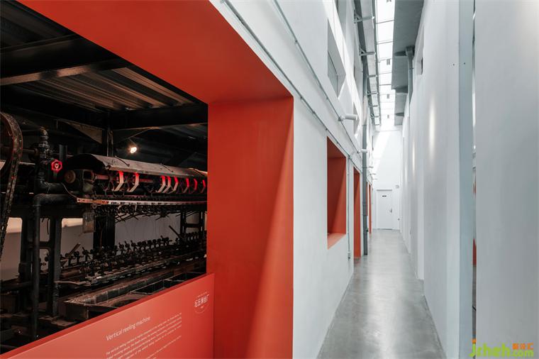 階梯下方保留了一臺(tái)煮繭機(jī)和一臺(tái)復(fù)搖機(jī),它們可以在南側(cè)的通高展廊被觀看和觸摸;階梯對(duì)面保留了一臺(tái)18m長的立繅機(jī)作為U·Talk講堂和秀場(chǎng)的背景,同時(shí)它也限定出走秀的環(huán)形動(dòng)線。在巨大混凝土橫梁的高度限制下,兩個(gè)橫向連廊成為整個(gè)二層空間得以環(huán)通的必要條件。位于二層的合作伙伴中心僅通過一排低矮落地窗便形成一個(gè)具有私密性的體量與開放的展覽空間形成對(duì)比。