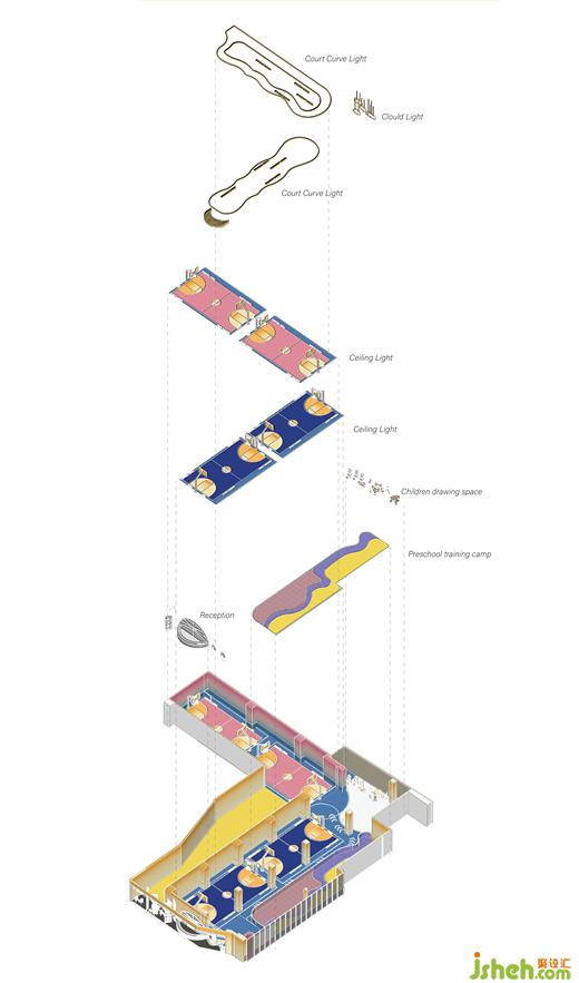 The goal of this venue is to create a sports playground that allows children to develop freely both physically and mentally. It explores the possibility of transcending the inherent form of the basketball court and allows people to change their perception of colors during exercise while maintaining the composition of the venue. The designer made creative colorful designs for indoor and floor signs, which, surrounded by bright colors, can stimulate children's richer emotions and imagination.
