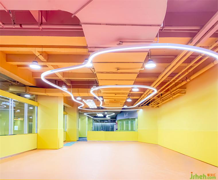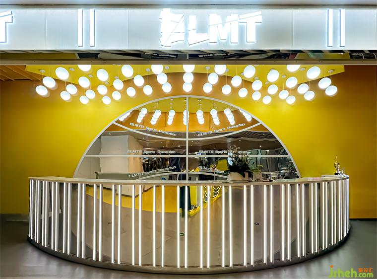 球形元素的亞克力燈與包在前臺上的線性燈柱,結(jié)合黃色也起到了加強空間線性的作用,旨在在視覺與材質(zhì)上將不同運動空間銜接在一起。