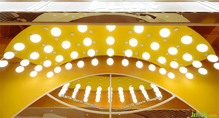 彩色設(shè)計致力于讓人一進入元素體育,就能感受到撲面而來的時尚活力的氣息,體育世界設(shè)計在入口前臺營造時,選用銀色金屬漆面和燈光的強烈視覺搭配突出力量感與線條感。背景墻和前臺融入了細膩的籃球形態(tài),在一目了然的籃球打造出整體感,而吊頂、周邊墻面以新型材料聚碳酸酯板和燈帶配以明黃色突出元素體育logo,通過有縱深感、有層次的圖底關(guān)系,充分展現(xiàn)出一個體育文化氛圍濃厚的公共空間。