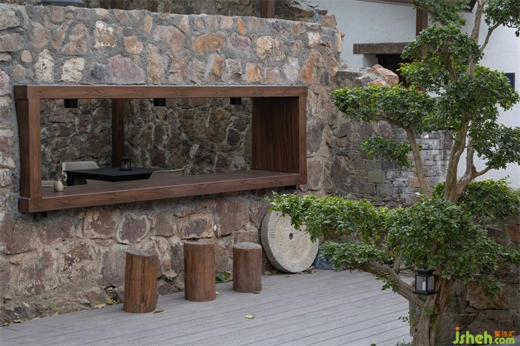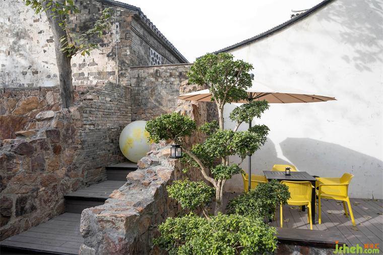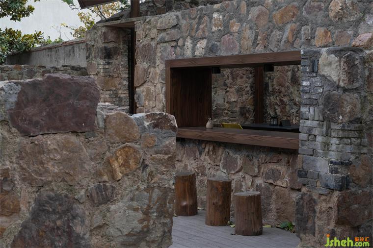 我們在保留后院遺存的黃石墻垣的基礎(chǔ)上,增加了平臺、階梯、座椅等元素,小酒館設(shè)計以滿足酒館業(yè)態(tài)的使用需求。新業(yè)態(tài)的植入使這片廢墟重獲新生,讓遺跡不再是僅供觀看的展品。