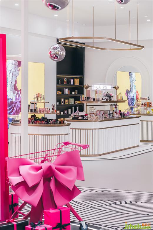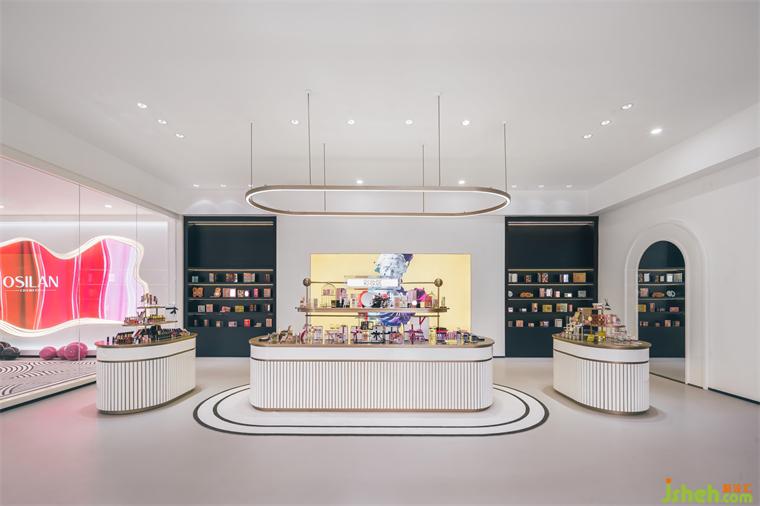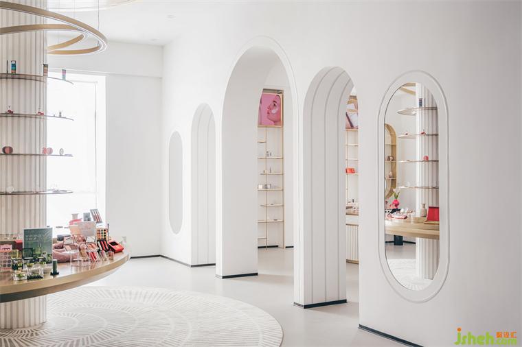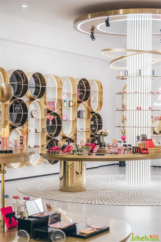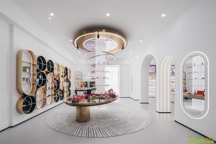In terms of modeling elements, the makeup area draws on European women's layered dresses and the form of Klinolin skirt, and is interspersed and superimposed in the form of large and small circles and ovals. The supporting columns are inlaid with LED lights, and the form of ribbons is rotated layer by layer and wrapped around the glass display rack on the columns. To weaken the strength and presence of the pillar.