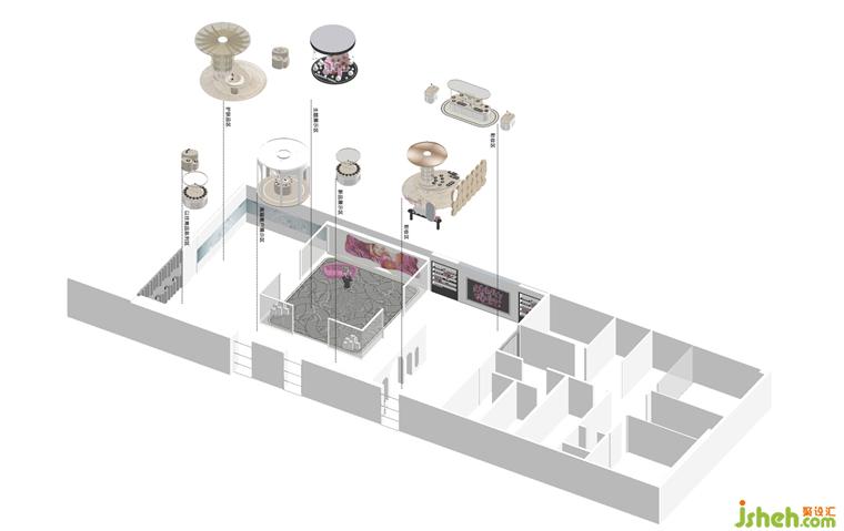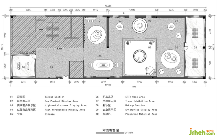 將整個(gè)展示空間按照四大部分功能進(jìn)行切塊,分別為包材區(qū)、企業(yè)文化展示區(qū)、展廳以及倉(cāng)庫(kù)。展示空間的整體方向圍繞感官體驗(yàn)以及歐美元素的融入而展開(kāi),利用裝置造型、材質(zhì)、商品陳列、智能數(shù)字化屏幕影像、背景音樂(lè)等,展示和傳遞著本季度業(yè)務(wù)向歐美國(guó)家拓展的信息。展廳依據(jù)感官的分類(lèi)并結(jié)合所需陳列的商品價(jià)值、功能、研發(fā)、合作方、季度主題等劃分為七個(gè)功能區(qū),分別為彩妝區(qū)、新品展示區(qū)、高端客戶(hù)展示區(qū)、以往商品陳列區(qū)、護(hù)膚品區(qū)以及主題展示區(qū)。展廳空間皆采用圓形或弧形的裝置,弱化了規(guī)矩且?guī)в欣饨堑拈L(zhǎng)方形空間,并結(jié)合對(duì)角線(xiàn)的方式進(jìn)行大小有序的排列布局。