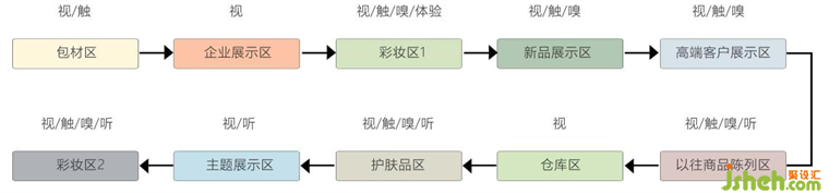對(duì)于空間中的人流動(dòng)線(xiàn),本次設(shè)計(jì)注重以人流動(dòng)線(xiàn)與空間之間相互作用的一種秩序感,以及穿插著自由的動(dòng)線(xiàn)類(lèi)型,避免了人群堆積的問(wèn)題又能使參觀者發(fā)揮自我意識(shí)與展品進(jìn)行互動(dòng),更好的挖掘出空間中潛在意思。在整體空間的流線(xiàn)設(shè)計(jì)上則采用單一的串聯(lián)式布局,按照線(xiàn)性順序組合排列且非常明晰,簡(jiǎn)化不必要的干擾元素,從文化宣傳—材質(zhì)—產(chǎn)品的一種模式,使參觀者的游覽路線(xiàn)將展示與體驗(yàn)交叉進(jìn)行,并隨著游覽路線(xiàn)的一步步推進(jìn)和空間呈現(xiàn)內(nèi)容的變化,除視覺(jué)和體驗(yàn)以外的其它感官也得到逐漸增加,參觀者在展示空間內(nèi)的情緒也逐漸發(fā)生變化。此外,在感官體驗(yàn)下的展示空間設(shè)計(jì)實(shí)踐中,展廳則作為展示空間的重要節(jié)點(diǎn),其客源數(shù)量相比于其它功能區(qū)域也較為聚集。