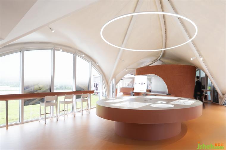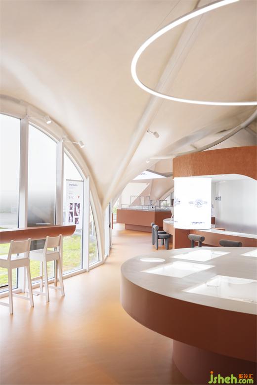 帶狀的展示接待臺(tái)作以一種更為柔軟的方式拆分了內(nèi)部工作區(qū)與外部公共區(qū)域,即承載了展示、接待的功能,又一定程度上定義了空間。