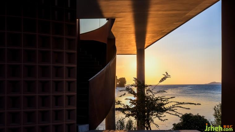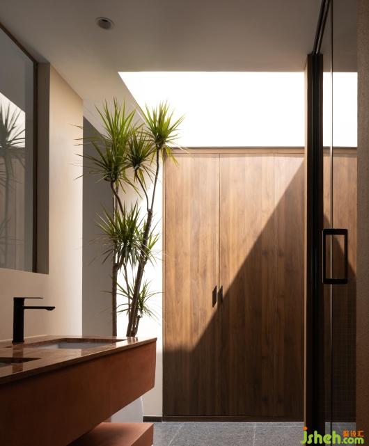 空間整體以陶土的磚紅色為基本色,靈感來(lái)源于從場(chǎng)地望向太湖的夕陽(yáng)。不同于中式山水畫(huà)的黑白,自然界的色彩是豐富而熱烈的。因此民宿主體部分采用了粗糙質(zhì)感的涂料,小圓筒體量用陶磚貼面強(qiáng)調(diào)。簡(jiǎn)單的建筑造型和質(zhì)樸的材質(zhì)互相襯托,同色系不同材料讓建筑立面的豐富度和可讀性得以提升。熱烈的色彩刺激人們的感官,在落日時(shí),這種感受將達(dá)到頂峰。建筑物既是作為框景存在的畫(huà)框,也可以是以自然為背景的視覺(jué)主體。
