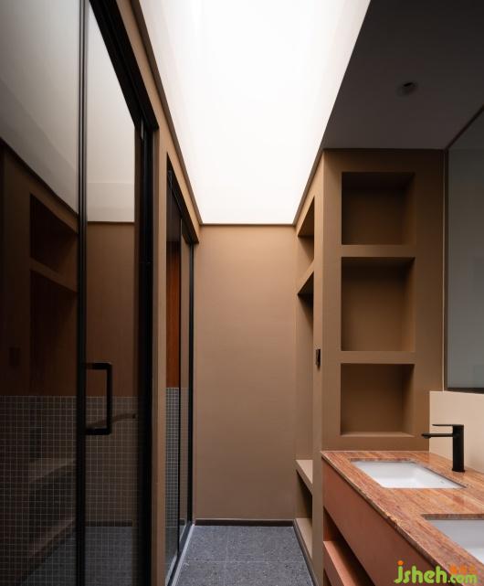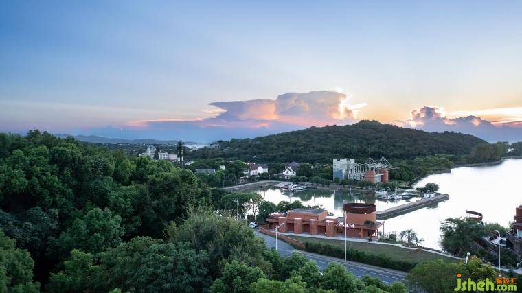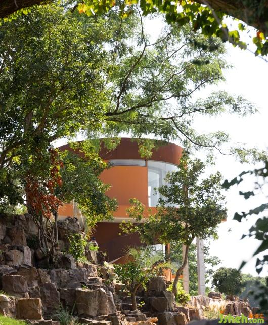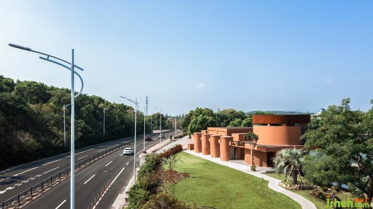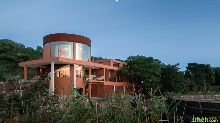 The overall color of the space is the brick red of terra cotta as the basic color, inspired by the sunset looking towards Taihu Lake from the grounds. Unlike the black and white of Chinese landscape paintings, the colors of nature are rich and warm. Therefore the main part of the B&B is painted with rough texture, and the small cylinder volume is emphasized with ceramic brick veneer. Simple architectural shapes and rustic materials set each other off, and different materials of the same color make the richness and readability of the building fa?ade enhanced. The warm colors stimulate the senses, which will reach its peak at sunset. The building is both a picture frame that exists as a framed scene and a visual subject with nature as a backdrop.