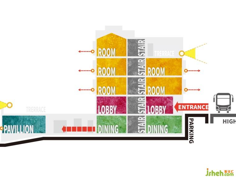 The south side of the building faces a highway, and beyond that, a series of mountains. This is also the entrance for the visitors. To the north, a more lively and dynamic view unfolds with theriver. During peak season, the water is filled with inflatable rafts and children playing joyfully. Guests can enjoy refreshments in the ground floor common area, dine in the basement restaurant, or walk through the waterside courtyard to play by the river. Through careful interior design, guest rooms on both the north and south sides offer window views of either the mountains or the river. A rooftop terrace provides additional leisure space, allowing the public areas to flow throughout the entire guesthouse.