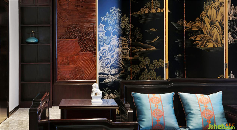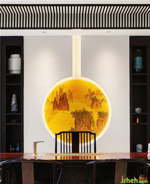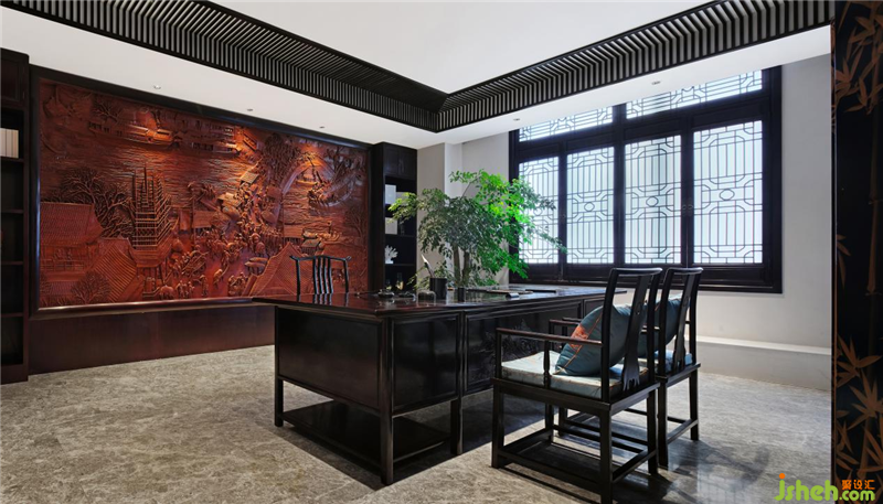 三進(jìn)營(yíng)造接待和辦公的區(qū)域,通過(guò)揚(yáng)州漆器屏風(fēng)讓這兩個(gè)區(qū)域隔而不斷。接待區(qū)除了沙發(fā),還根據(jù)使用者個(gè)人的喜好,設(shè)置了個(gè)人的喝茶品酒區(qū),南京會(huì)所設(shè)計(jì)為了空間風(fēng)格上的融合,用了同紅木色的柜體。而辦公區(qū)背景設(shè)計(jì)的是紅木雕,即《清明上河圖》中最熱鬧的一段畫(huà)面場(chǎng)景,不用爆品背景裝飾。